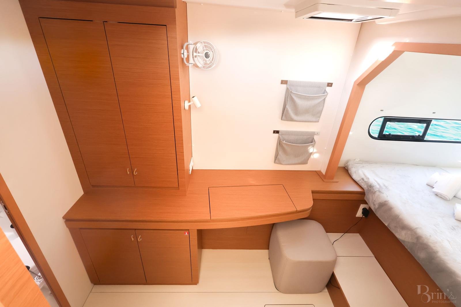 Le modèle est très bien doté : guindeau électrique, annexe+hors-bord, winch électrique, bimini, table de cockpit, selon les configurations. Dans notre version 3 cabines, on retrouve notamment :