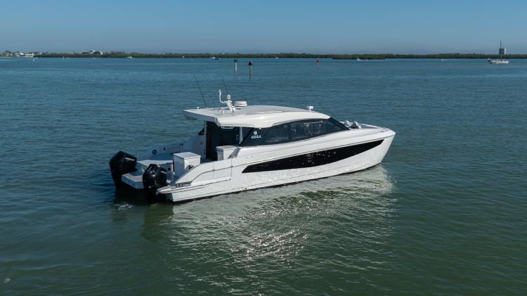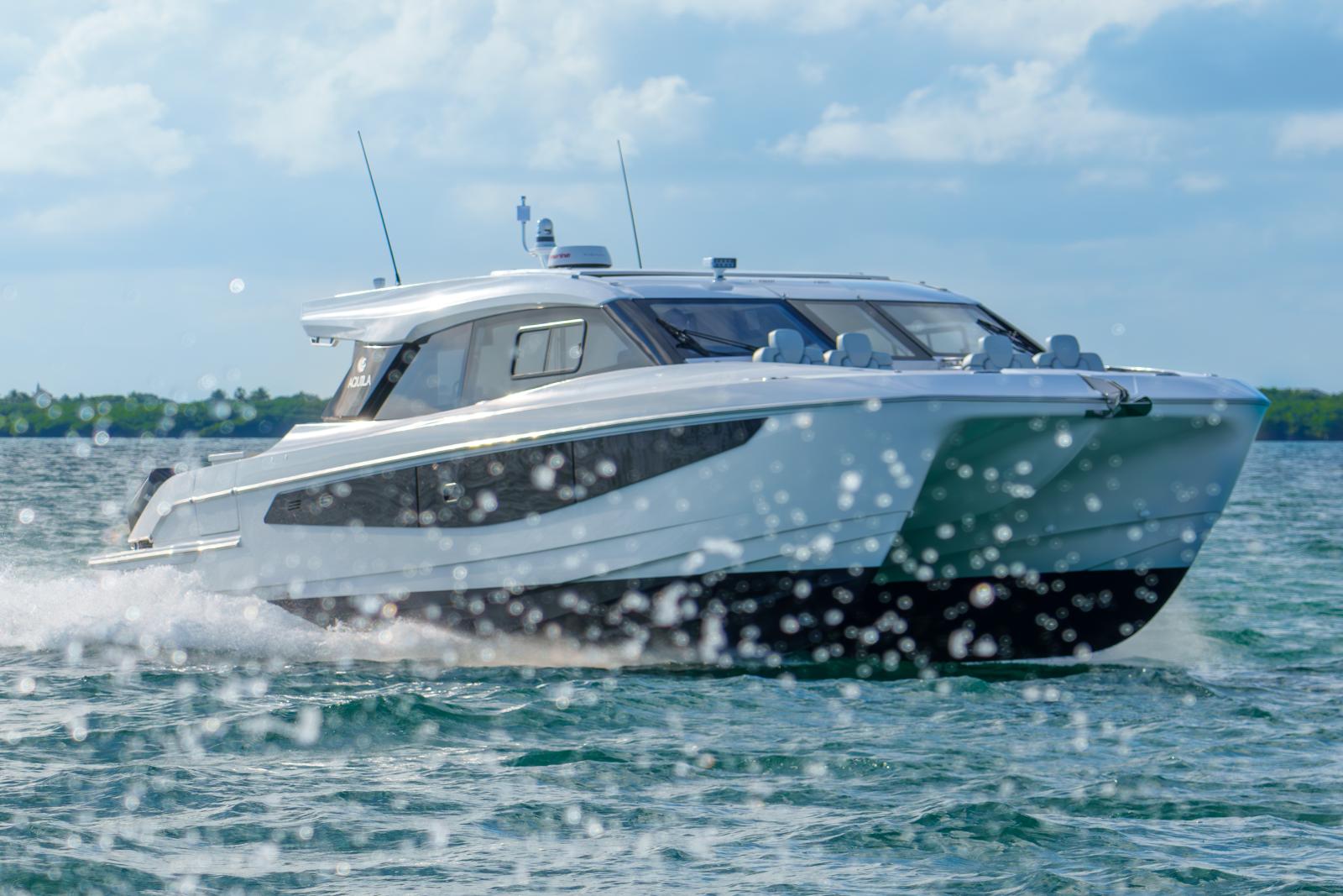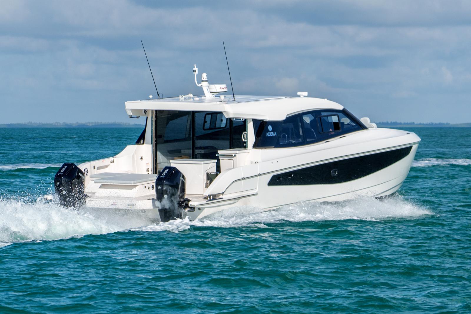 Dimensions : 13,06 m hors-tout avec moteurs hors-bord, ou 12,88 m avec moteurs inboard, pour une largeur de 4,85 m
