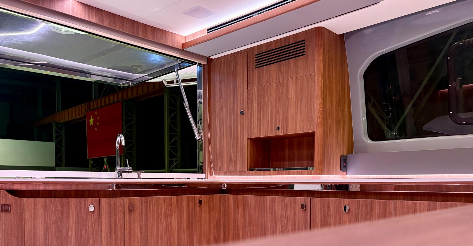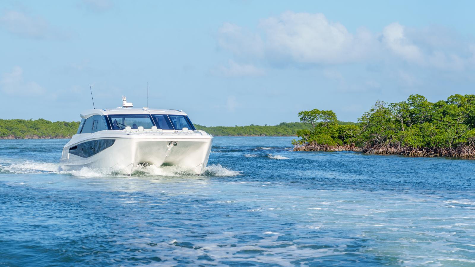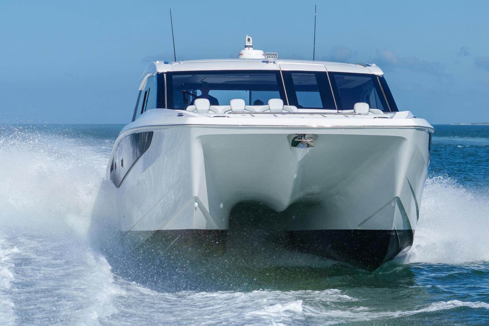 Malgré son gabarit plus bas, il offre une largeur impressionnante grâce à la plateforme catamaran, avec beaucoup plus de volume habitable qu’un monocoque de taille équivalente.