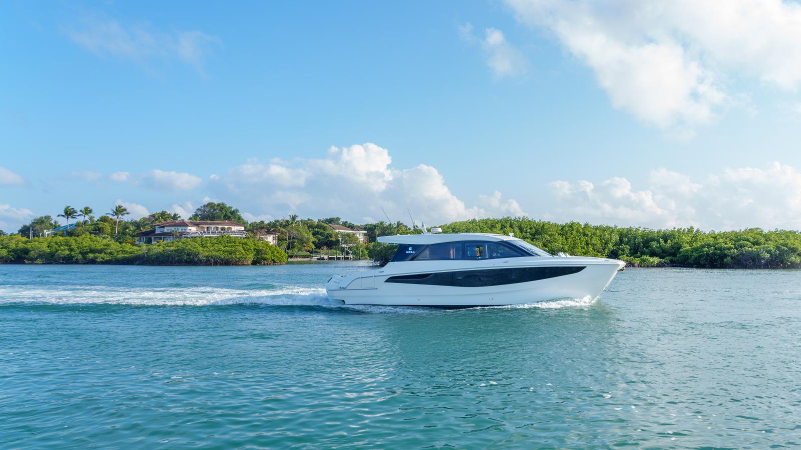 Contrairement aux modèles Flybridge, la version Coupé a un look plus sportif et plus bas sur l’eau.